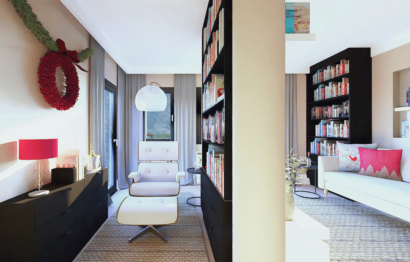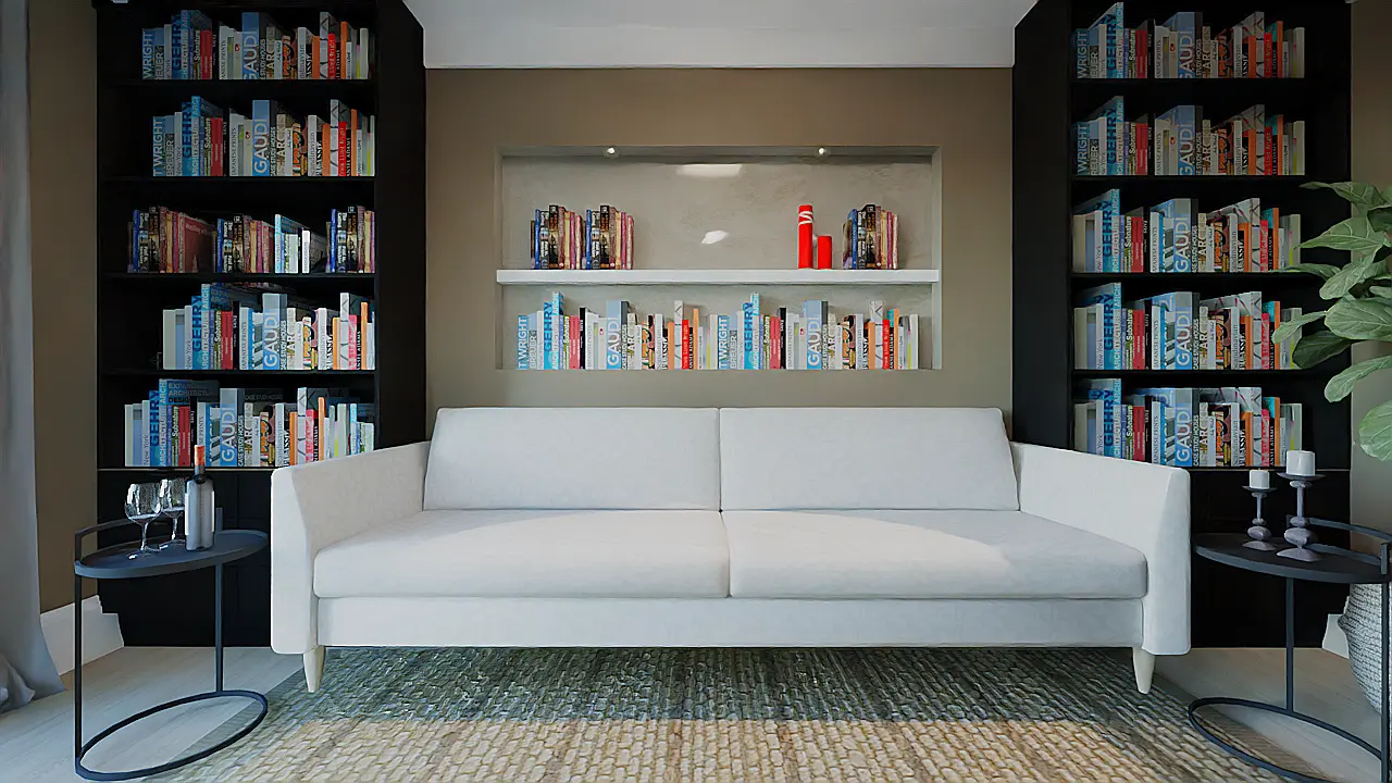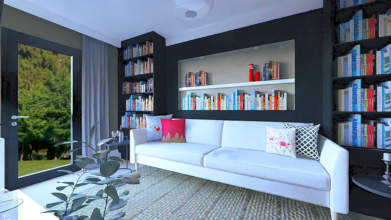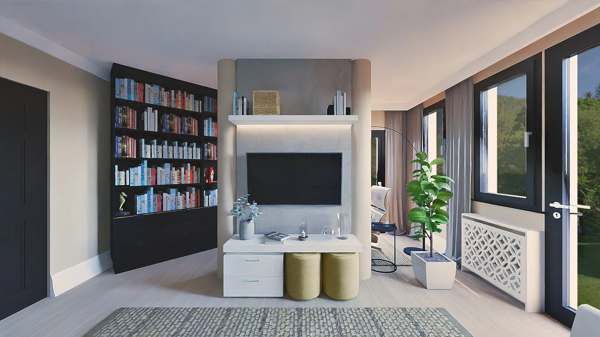 A szokatlan alaprajzú nappaliban összességében 20 méternyi könyvnek kellett bútort tervezni (lakberendezésben nem darabszámra, hanem méterre adjuk meg a könyvek mennyiségét). A helyiségben az oszlopnak maradnia kellett, ami elég szerencsétlenül osztotta meg a teret. Ezért inkább kihasználva, egy ugyan ilyen oszlop berakásával, és a közé épített gipszkarton fallal választottam el a kért tévéző- és olvasósarkot.